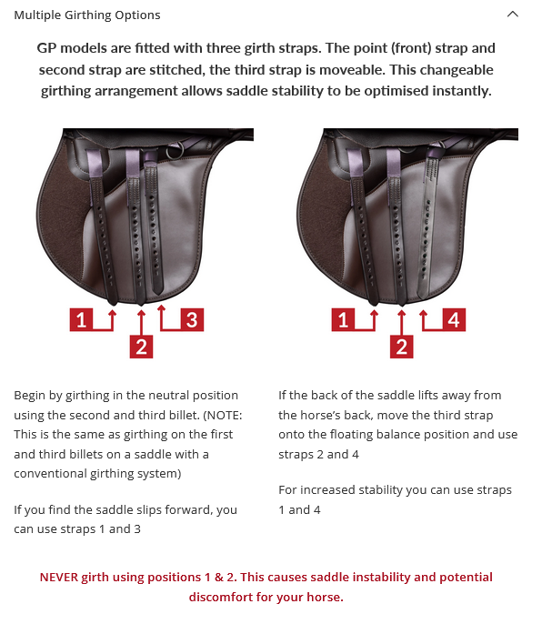 - Girthing System: Adjustable balance strap system
