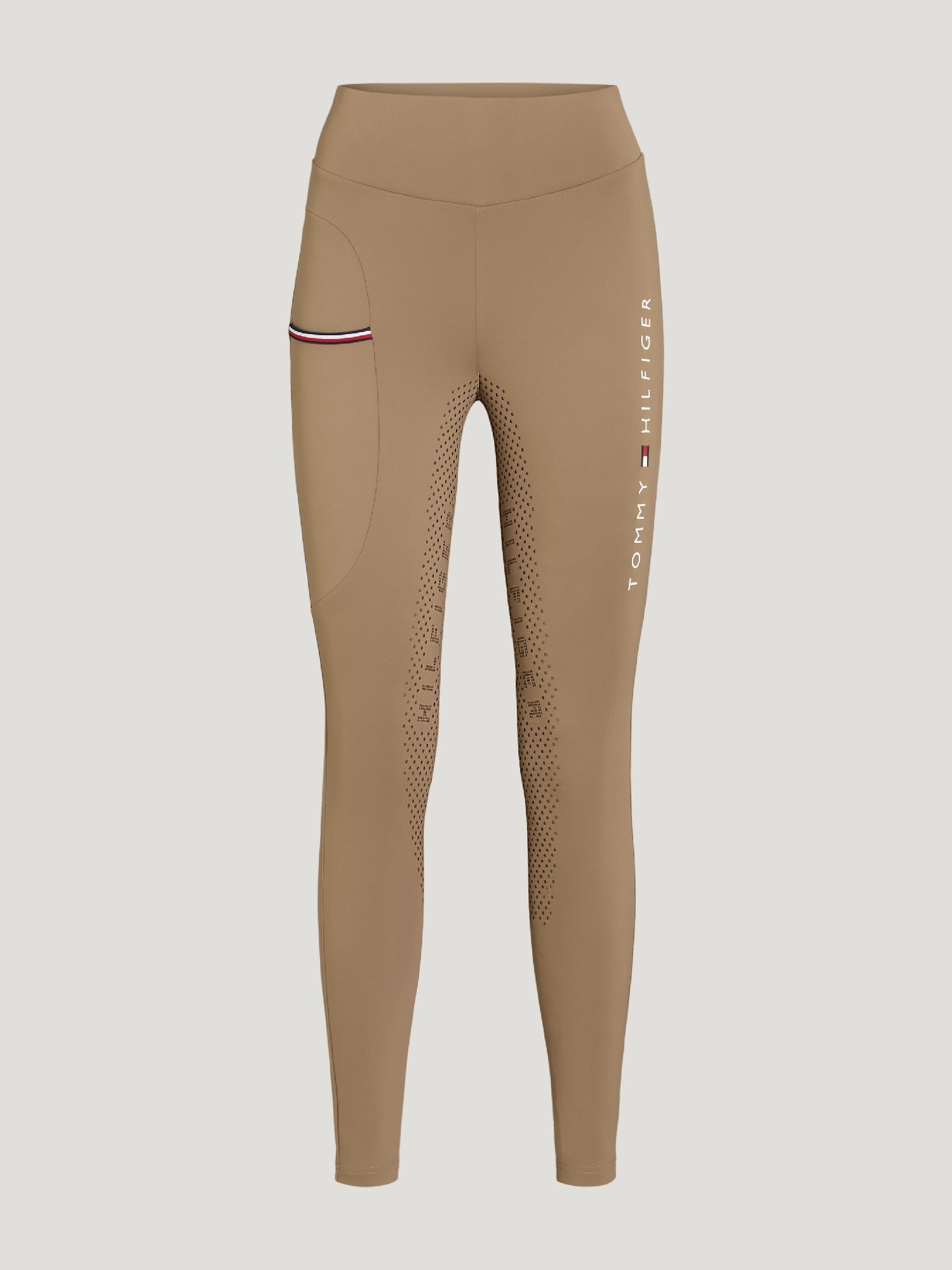 Practical details include a secure phone pocket and durable silicone grip print for extra stability in the saddle. Subtle Tommy Hilfiger branding and the earthy Fossil tone give these tights a refined, modern finish that transitions effortlessly from training days to stable chores.